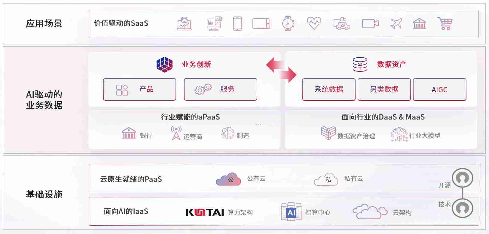 数字时代,,围绕企业数字化转型的关键要素,,z6com·尊龙凯时数码开创性的提出数云融合战略和技术体系框架,,着力在云原生、、数字原生、、、、AI原生和信创产业上架构产品和服务能力,,,,为处在不同数字化转型阶段的快消零售、、、汽车、、、、金融、、医疗、、、、政企、、教育、、运营商等行业客户提供泛在的敏捷IT能力和融合的数据驱动能力,,,,构建跨界融合创新的数字业务场景和新业务模式,,,助力企业级客户建立面向未来的核心能力和竞争优势,,全面推动社会的数字化、、智能化转型升级。。